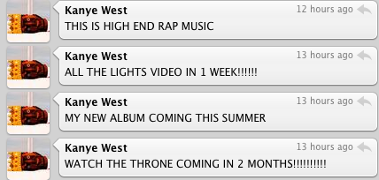 Take it with a grain of salt, but Kanye Tweeted earlier that he’d have a new solo LP due by Summer. That’s in addition to his collaborative LP with Jay-Z, Watch The Throne, hitting in March. Also, “All of The Lights” video dropping soon, he adds.