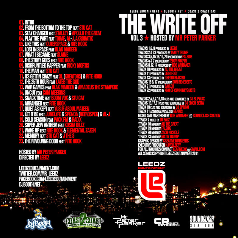 Boston-based indie label Leedz Edutainment has come together with The DJBooth and Coast 2 Coast DJs to bring listeners their latest compilation album, The Write Off Vol. 3. Hosted by Mr. Peter Parker, the project features 23 fresh records from a variety of the game’s hottest underground/up-and-coming emcees. Included are previously-featured, reader-approved leaks “From the Bottom to the Top” and “Stay Charged.” The Write Off Vol. 3 features contributions from such artists as Stalley, Apollo the Great, Slaine, Cam Meekins, Boom Vox, PackFM, Kosha Dillz, Torae, Akrobatik, Outerspace, Stu Cat and J The S. Beats come courtesy of Leedz, Matty Trump, Falside, Teddy Roxpin, Rob Whitaker, Ali the Great, Lightfoot, Ghetto Blaster, Don Benedetto, Saylor and Kno (of the Cunninlynguists).