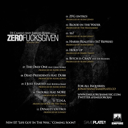 Emilio Rojas teams with DJ Camilo for Zero Fucks Given Vol. One, with guest contributions from Joe Budden, N.O.R.E., Bodega Bamz, Harry Fraud, The Heatmakerz, Audio Jones, Lowkey, Dubb, and Gene Noble.
